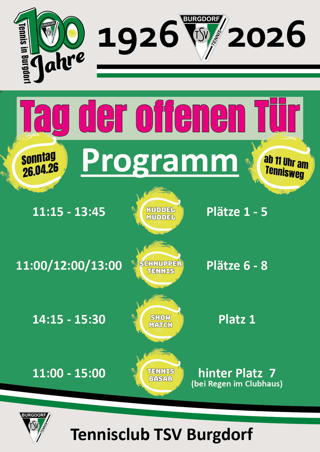 Im Jahr 2026 feiert unser Tennisclub ein Jahrhundert voller Leidenschaft, Gemeinschaft und sportlicher Erfolge. Seit 1926 stehen wir für Fairplay, Zusammenhalt und die Freude am Spiel – getragen von uns allen, die diesen Ort mit Leben füllen und die Begeisterung für den Tennissport mitunter von Generation zu Generation weitergeben.